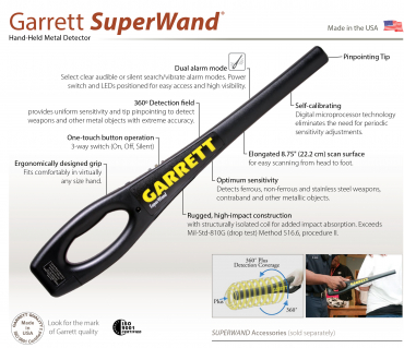 The Superwand Garrett is the most advanced handheld detector for security purposes. It comes with a 360 degree detection field, is ergonomically formed and very easy to use and maintain. It allows the used to quickly scan and check a person and detect all types of dangerous metal object immediately. The optimal solution for security checkpoints where even large numbers of people need to be screened manually.
