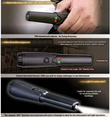 The THD or Tactical Handheld Detector is an extremely compact detector designed for law enforcement officers. It is extremely lightweight, small and robust. This detector meets the highest quality standards and is standard gear for rangers and law enforcement officers in the US. It has a 360° detection field. Due to its small size it can be used in all kinds of environments even very crowded and tight spaced such as schools, events, bars, gathering and alike. Its an essential part of professional law enforcement officers gear.
